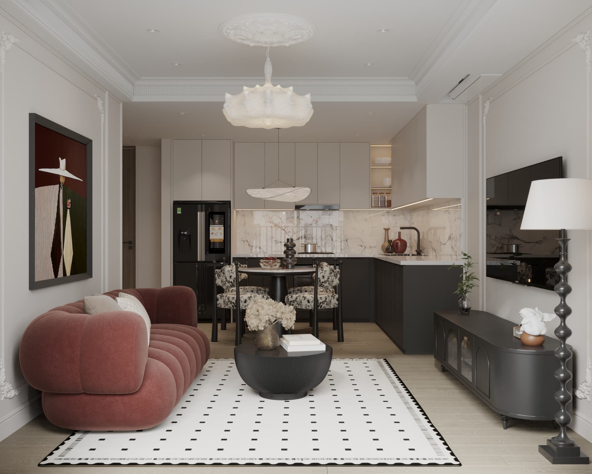 Nghệ thuật Mix & Match (Pha trộn): Sự kết hợp táo bạo giữa đồ nội thất cổ điển (Vintage/Antique) với các món đồ hiện đại, thời thượng. Một chiếc ghế sofa nhung có thể đặt cạnh một chiếc bàn kim loại hiện đại.